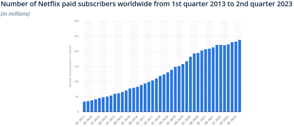 Statista Report shows that as of the second quarter of 2023, Netflix had more than 238.39 million paid subscribers worldwide. This marked a significant increase of 5.89 million subscribers in the previous quarter. Most subscribers are based in the EMEA region (Europe, Middle East, and Africa), accounting for nearly 80 million of Netflix’s global subscribers.